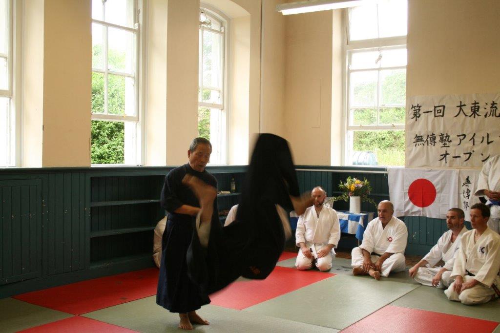 A unique event took place in the village of Thomastown, Kilkenny this June. It was the venue for the first ever Irish seminar in the traditional Japanese art of Daito Ryu Aiki jujutsu. Moreover, this seminar also had the distinction of being taught by two instructors from two ryu ha (factions) of the art: Hiroo Iida, a shihan (master level) instructor and lineage student of Kodo Horikawa, and Ole Kingston jun kyoju dairi,(licenced teacher), lineage student of Okamoto Seigo shihan, one Horikawa’s earliest and highest-level students. These two instructors presented methodology stemming from a common source, but they also showed distinct aspects of the Daito ryu that informed each other. Practitioners were thus able to receive a comparative, broad and comprehensive overview of the principles of this fascinating art.